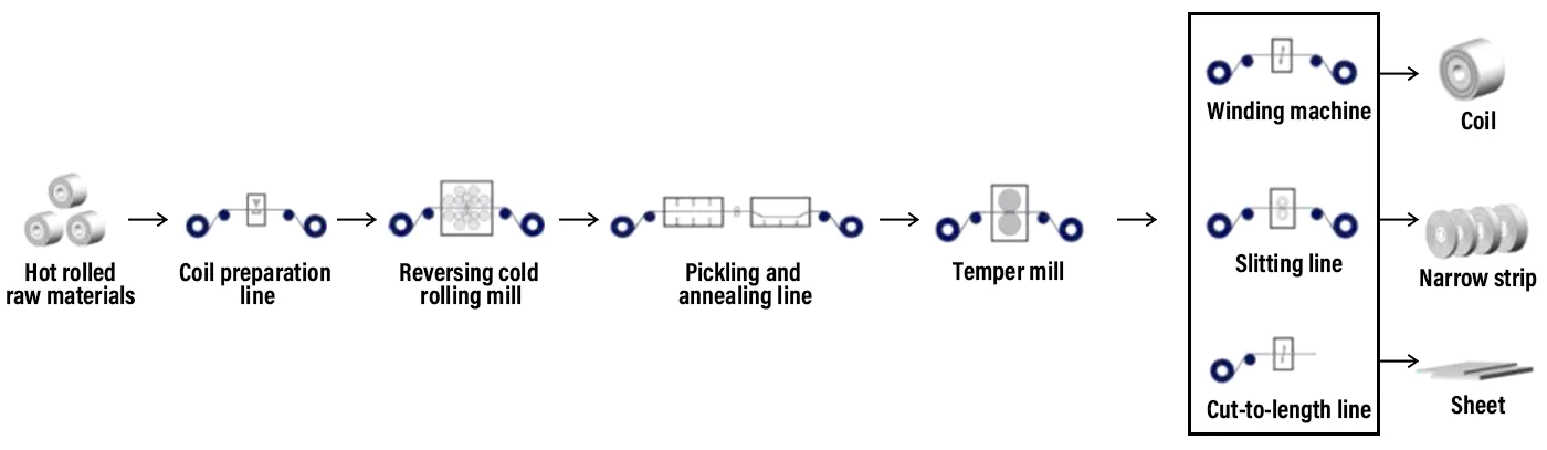 In this process flow, the hot-rolled stainless steel raw materials are rolled by the cold rolling mill for multiple passes to reach the target thickness, and then the pickling and annealing process is carried out to achieve the required mechanical properties and surface effects; finally, the temper process is carried out to optimize the surface quality of the stainless steel sheet and strip. The wide width cold-rolled stainless steel sheet and strip produced through this process flow has a 2B surface and belongs to the soft cold-rolled stainless steel sheet and strip in terms of mechanical properties.