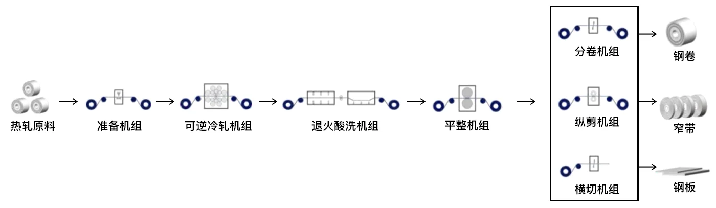 此工艺流程将热轧不锈钢原材料经冷轧机组进行多道次轧制达到目标厚度 后再经酸洗退火工艺达到所需的机械性能和表面效果,最后经平整工序对不锈钢板带表面质量进行优化处理。此工艺流程生产的宽幅冷轧不锈钢板带表面为 2B 效果,在机械性能方面属于软态冷轧不锈钢板带。